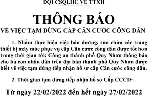 Công an thành phố Quy Nhơn thông báo về việc tạm dừng cấp Căn cước công dân từ ngày 22/02/2022 đến hết ngày 27/02/2022 nhằm thực hiện việc bảo dưỡng, sữa chữa các trang thiết bị máy móc phục vụ cấp Căn cước công dân được tốt hơn trong thời gian tới; Công an thành phố ...